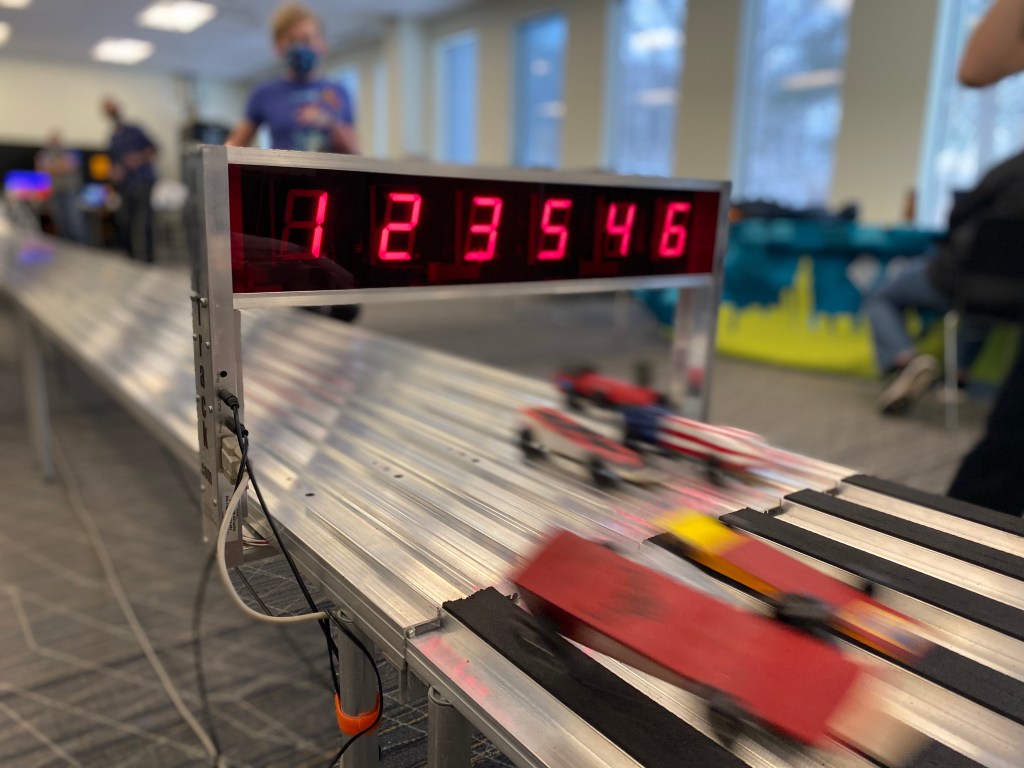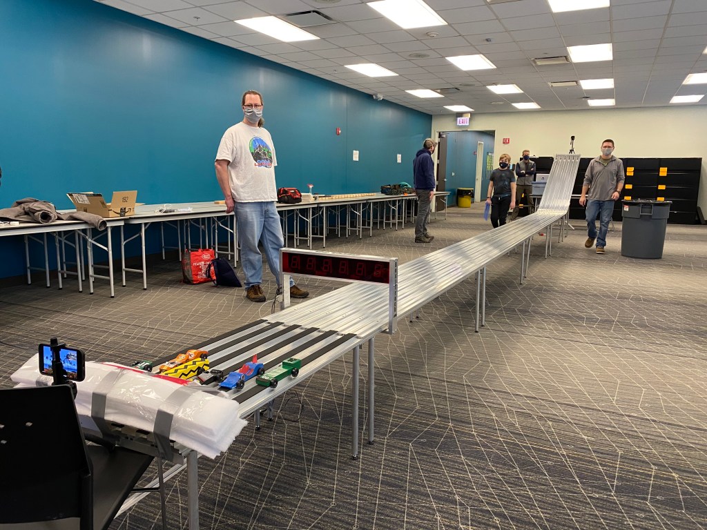 We collected the track out of the school basement, had a Leader Dad with a connection to a building warehouse that was willing to host us, came up with inventive camera angles, asked an enthusiastic friend of a Pack Dad to be our MC and, ta-da – it went off without a hitch.