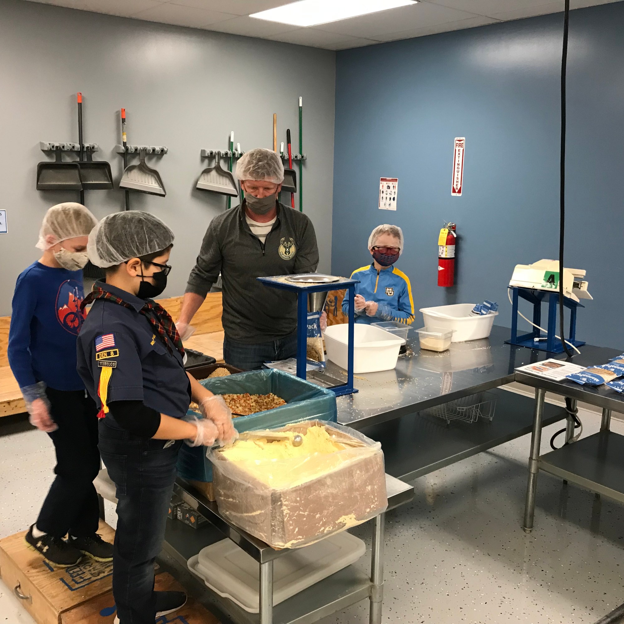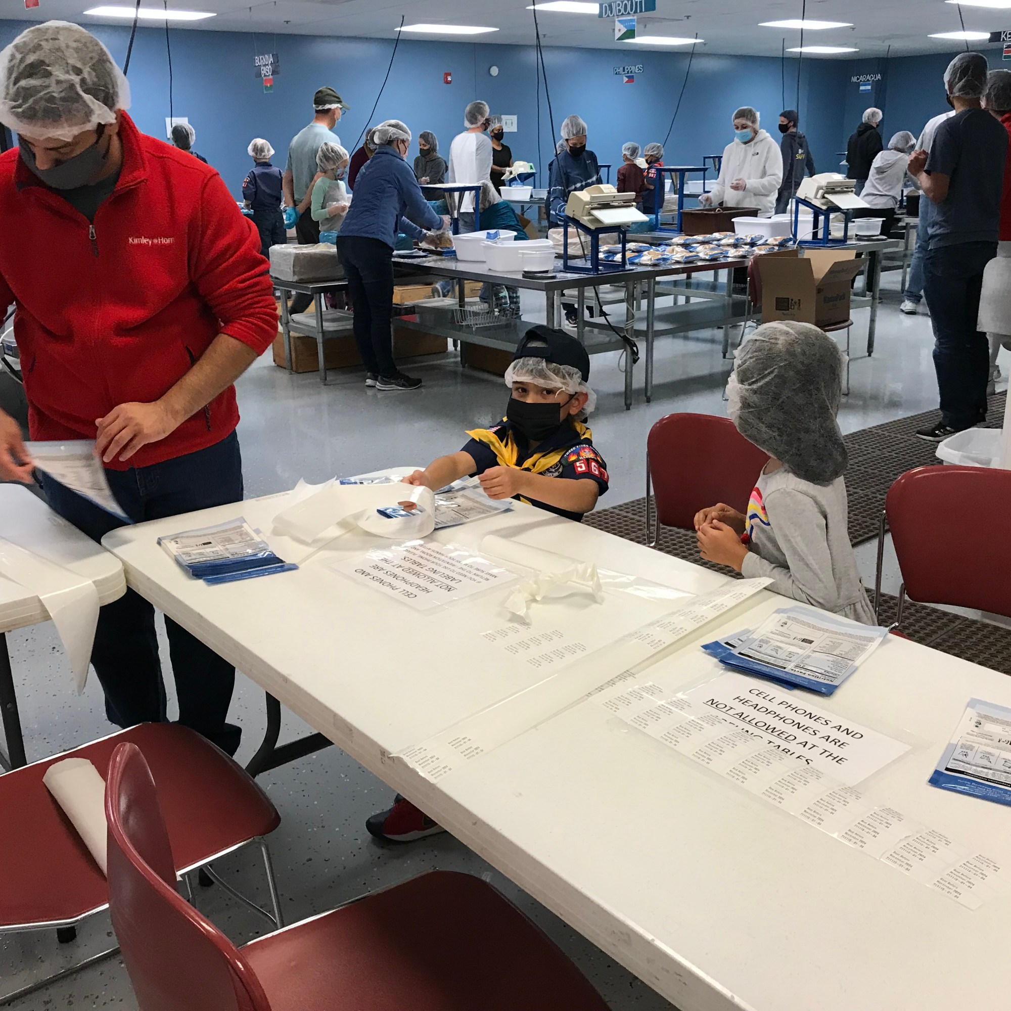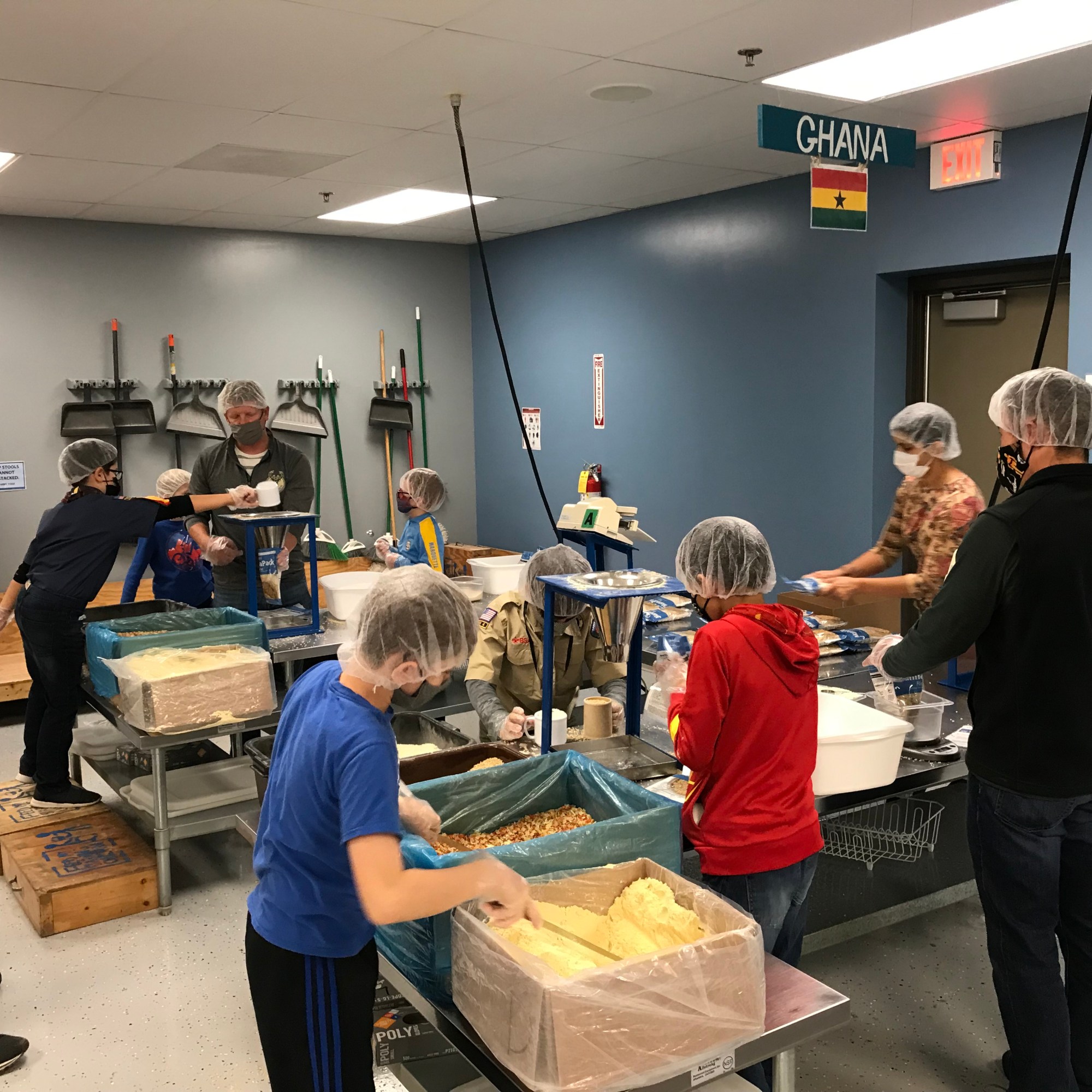 In November, about 15 Scouts and their parents volunteered at Feed My Starving Children. The meals we packed help feed kids and families around the world. One of the great ways Scouts learn to help others.