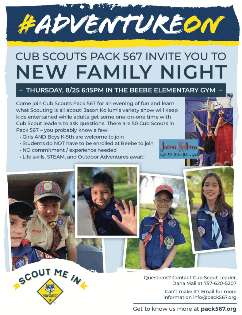 Join Pack 567 for an evening of fun! We’ll have opening games, a few awards presented, and an incredible variety show hosted by Jason Kollum. New families are welcome to come learn what Cub Scouts is all about! Let’s have some fun together Thursday 8/25 at 6:16pm in the Beebe School Gym. See you soon!