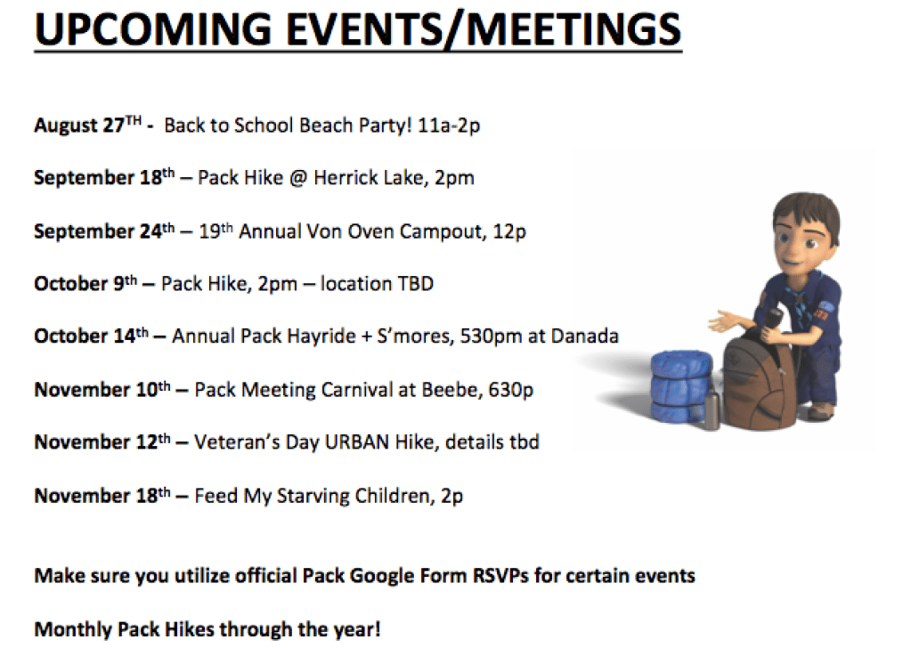 While each year is different, this timeline gives a great snapshot of what a typical year looks like at the Pack level. There will be monthly Pack Hikes sprinkled in. Extra opportunities to camp along the way. And, of course, your grade-level den meetings to achieve adventure ranks.